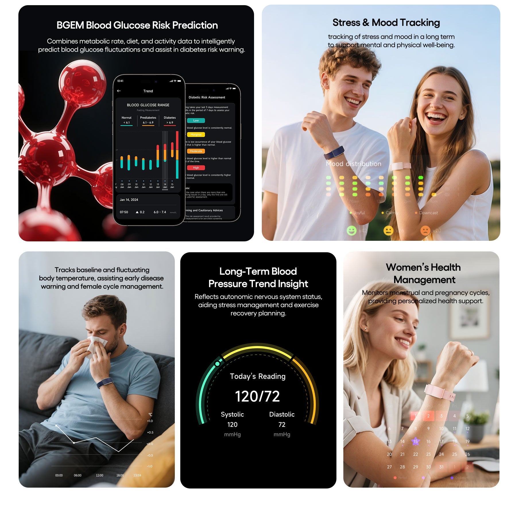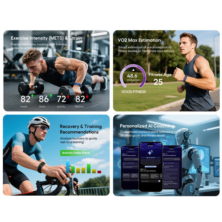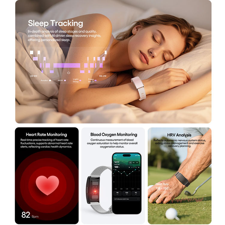 The V5 uses our proprietary BGEM (Blood Glucose Estimation Model). It doesn't measure blood sugar directly; instead, it analyzes your metabolic rate, heart rate variability (HRV), sleep quality, and activity levels to intelligently predict glucose fluctuation risks and provide early wellness warnings.
