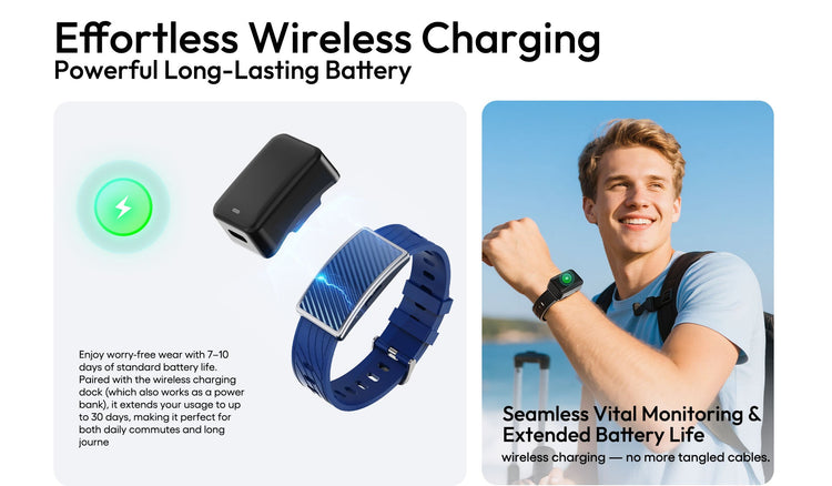The V5 supports effortless wireless charging. The included charging dock also acts as a portable power bank. On its own, the band lasts 7–10 days; when paired with the charging dock, you can extend your journey up to 30 days without needing a wall outlet.